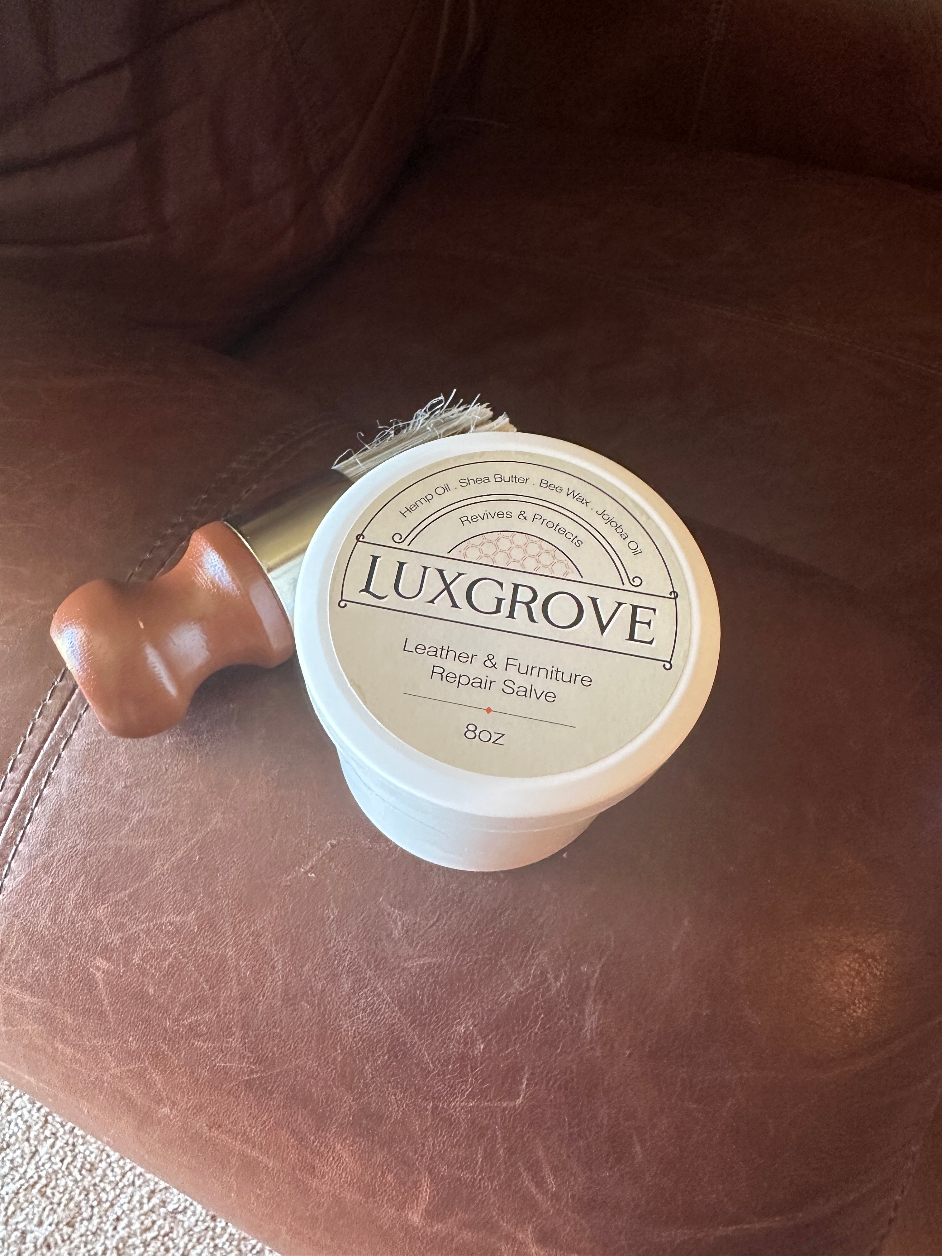 I’ve never reviewed a product before but this salve is a must-have product for restoring leather furniture. I originally bought it to restore a vintage Ralph Lauren Chesterfield sofa I have but wanted to test it first. I used it on my Ethan Allen leather armchair with Luxgrove and was amazed at how well it turned out. A little bit goes a long way, I applied cream with the brush and rubbed the product in thoroughly, letting it set overnight. The finished result is amazing!! My chair looks brand new and the leather cream covered up all the dry, cracked, water-stained, scratched surfaces. I highly recommend this ‘awesome sauce’ for anyone wanting to restore their leather furniture.